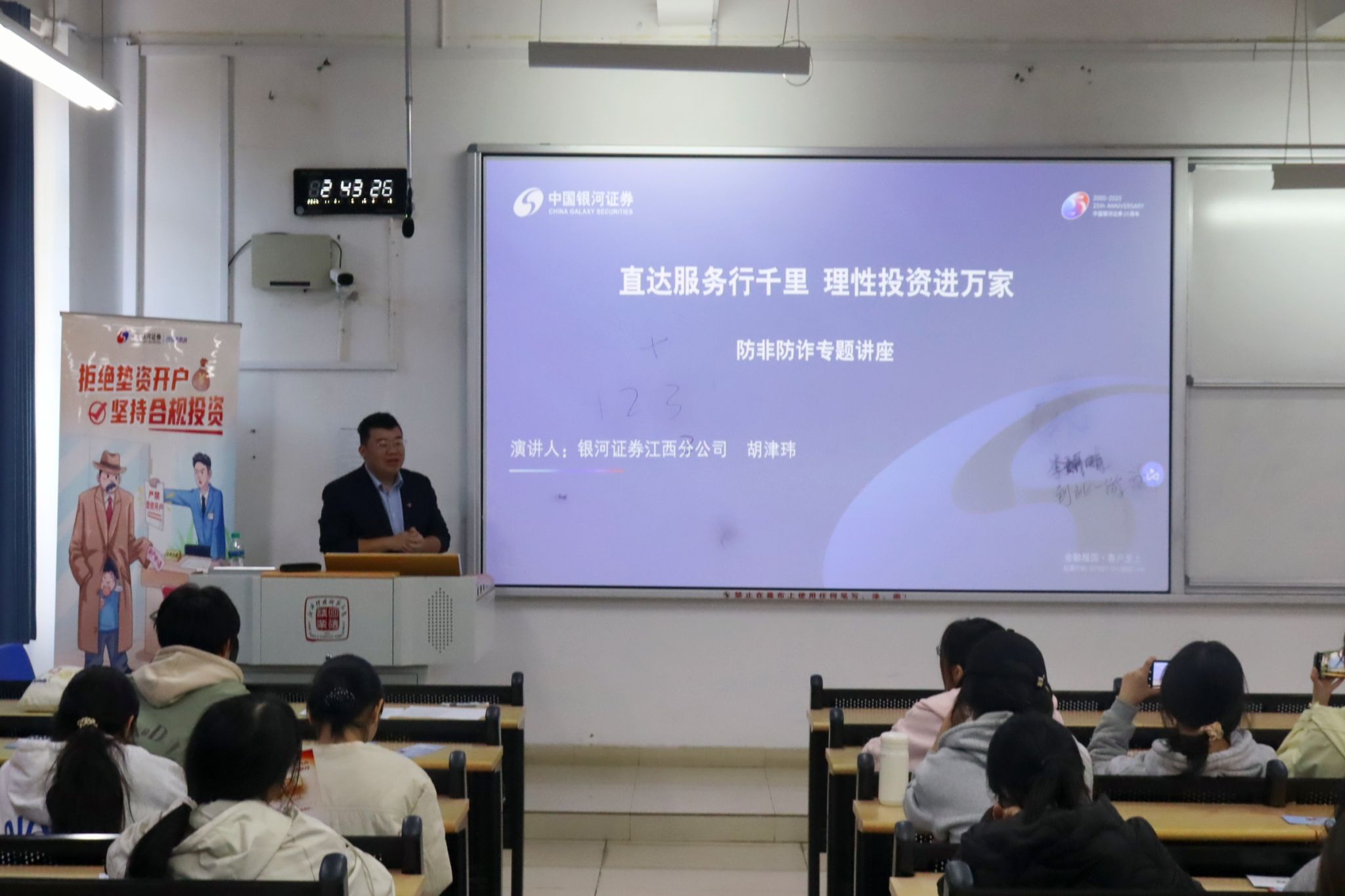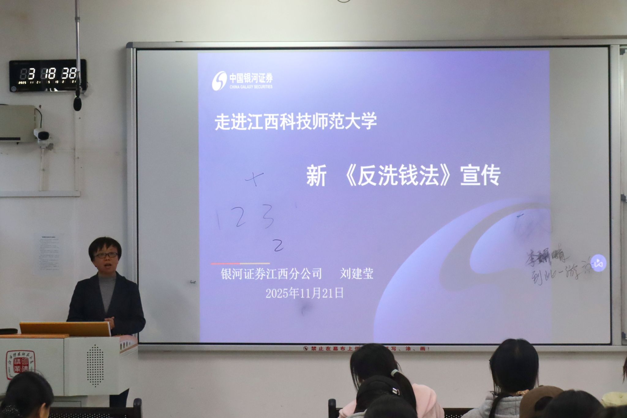 紧接着,防非防诈与反洗钱专题讲座相继展开。银河证券江西分公司胡津玮结合典型案例,揭露了非法金融活动的各类陷阱,并分享了具体的防范技巧。其同事刘建莹则解读了新《反洗钱法》的修订内容,强化了同学们的合规观念。活动最后,同学们纷纷表示,讲座帮助他们掌握了资本市场核心知识与防非防诈常识,进一步提升了金融安全意识与理性投资理念。