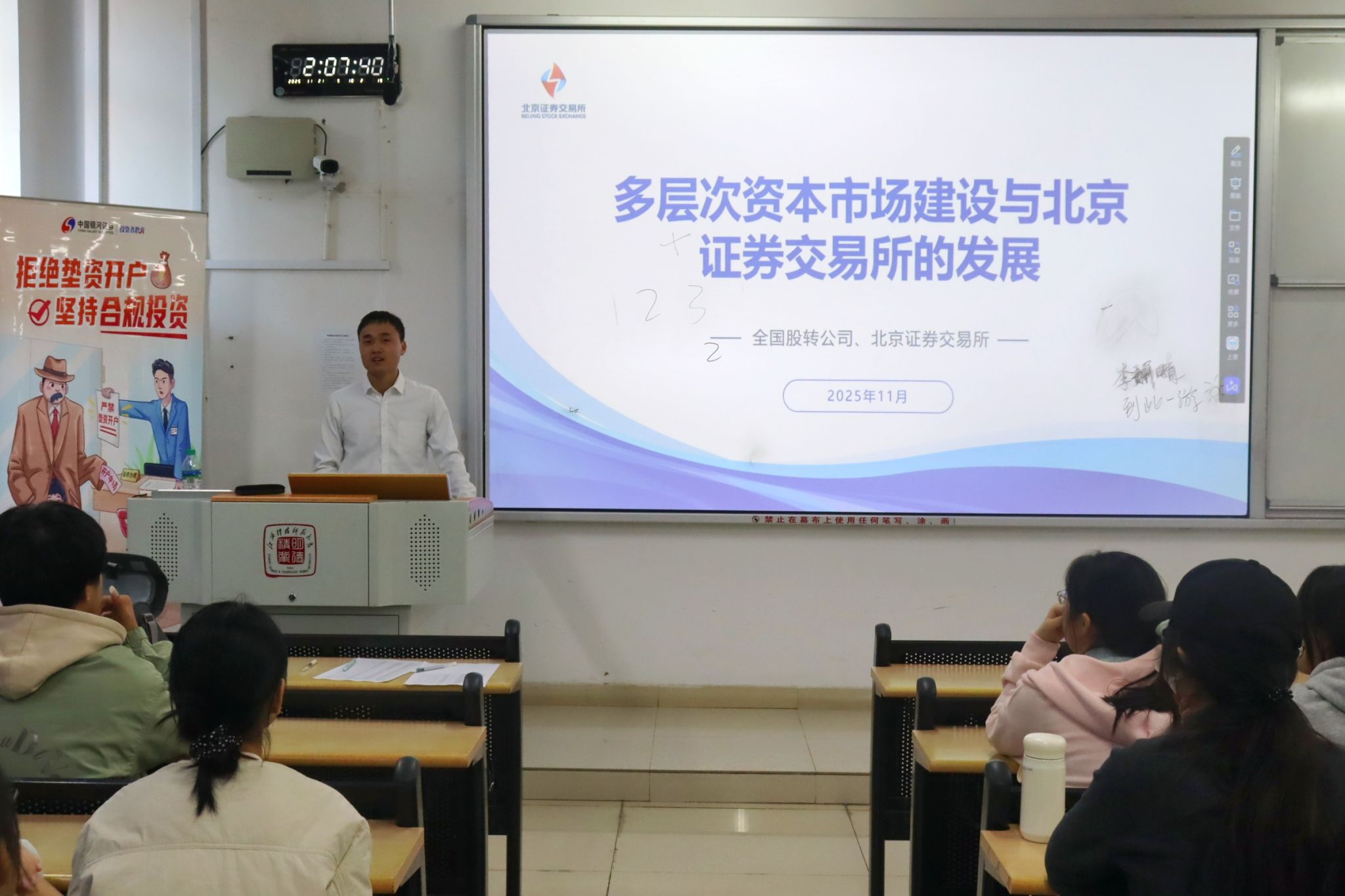 为帮助学生增强金融安全意识,树立理性投资观念,提升金融素养与风险防范能力,2025年11月21日下午2:00,江西科技师范大学经济管理与法学院联合北京证券交易所投资者教育基地、中国银河证券投资者教育基地,在逸夫楼Y110教室顺利举办“直达服务行千里,理性投资进万家”主题讲座。