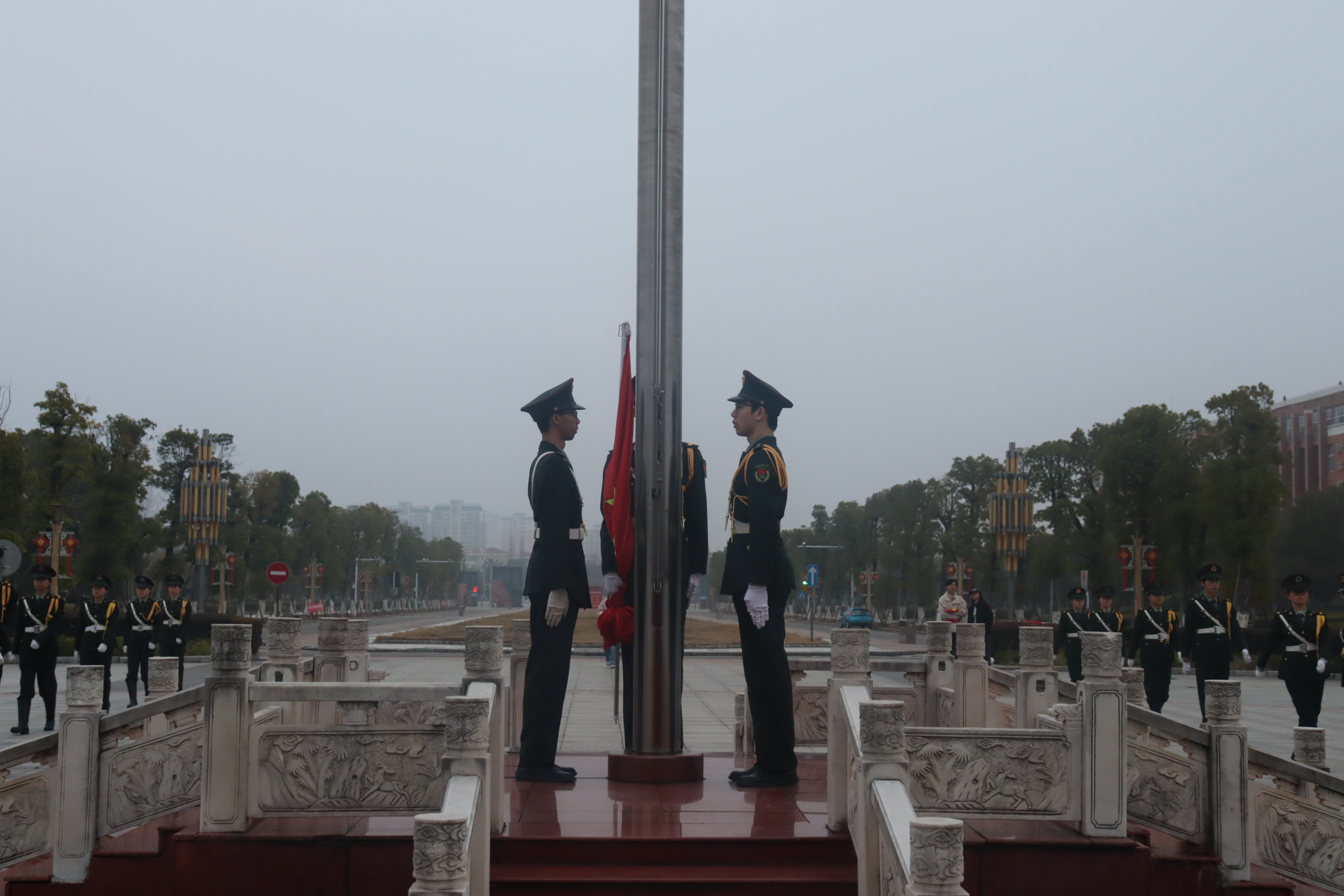 晨光微露,朝霞映照。国旗护卫队队员身着整齐制服,迈着坚定有力、整齐划一的步伐,护送五星红旗走向升旗台。伴随着《义勇军进行曲》在校园响起,五星红旗在晨风中缓缓升起,全体学生庄严肃立,行注目礼,齐声高唱国歌。