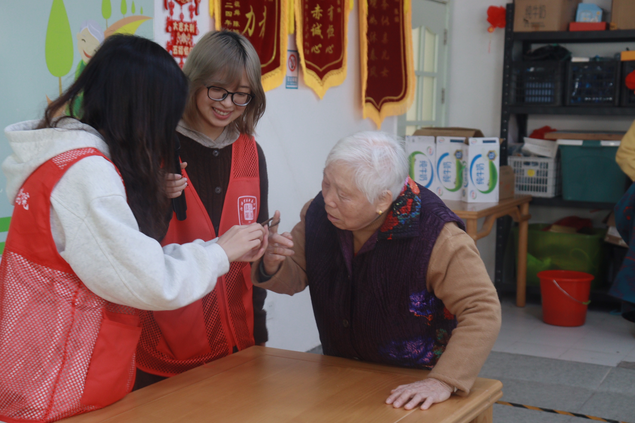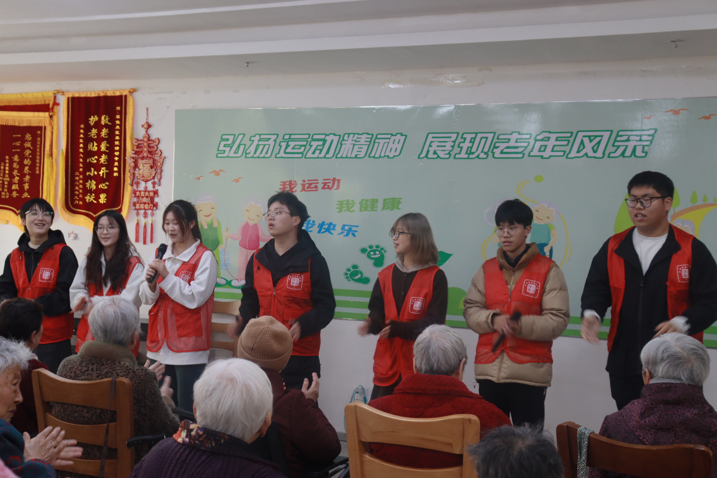 情系桑榆,爱在细节。志愿者们走进医养院,与老人促膝长谈,耐心倾听他们讲述过往,并陪同他们聊天谈心,共享温馨时光。志愿者们还合唱《桃花朵朵开》,用歌声传递温暖,以旋律表达温情。手指操、魔术表演等互动活动让现场气氛融洽,老人的笑声回荡在医养院的每一个角落。