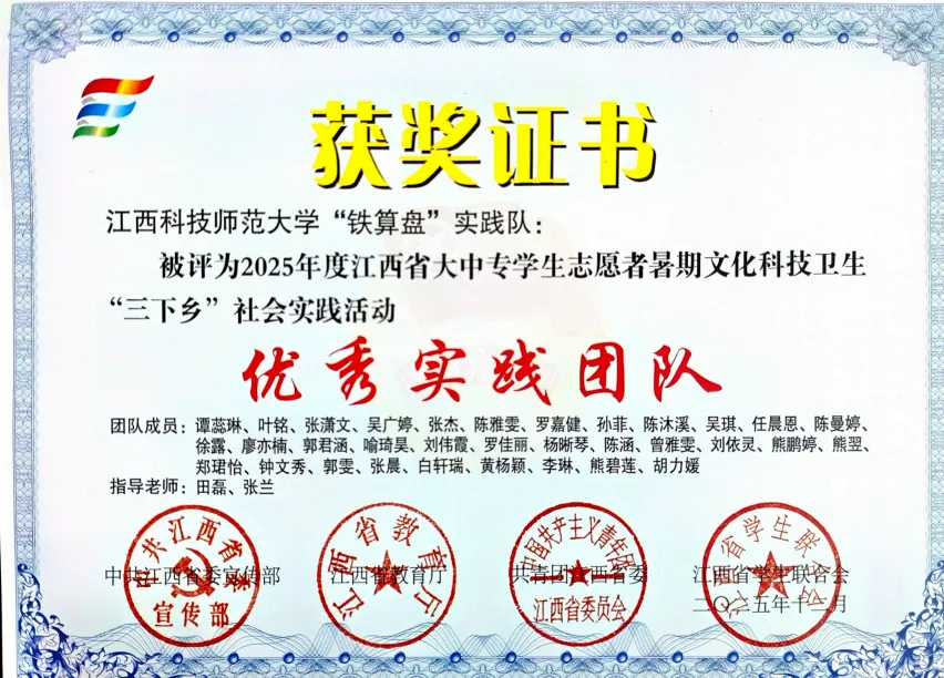 近日,2025年江西省大中专学生志愿者暑期“三下乡”社会实践活动评选结果公布,我院“铁算盘”实践队脱颖而出,荣获“优秀实践团队”称号。