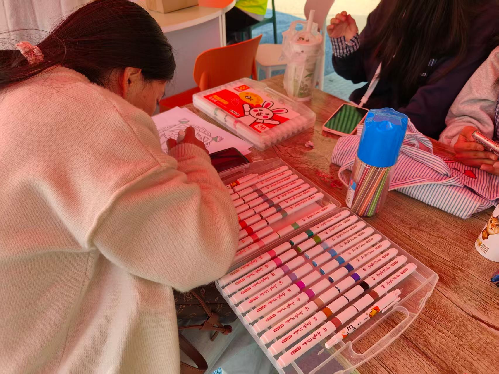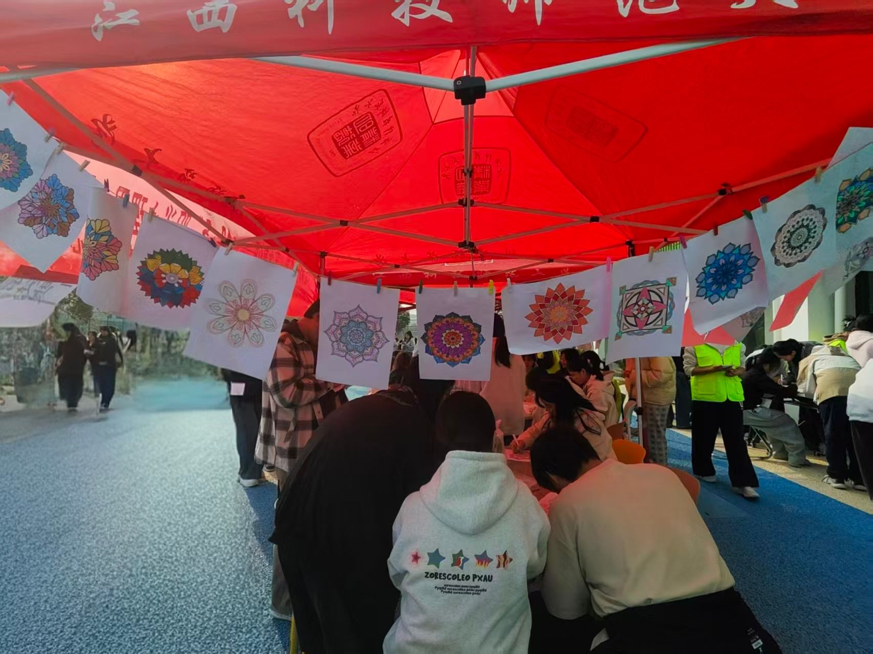 此次活动,以艺术为核心载体,旨在通过有氧鼓圈、曼陀罗绘画、曼达拉编织等多元形式,为同学们搭建了一个安全、自由的情绪表达平台。其中,经济管理与法学院主要负责“曼陀罗绘画”板块,现场气氛热烈而有序。活动开始时,每位同学领取一张印有基础曼陀罗轮廓的画纸,以及一套水溶性彩铅和马克笔。工作人员则在旁轻声引导,并播放流水声等白噪音,帮助同学们放松身心、沉浸式创作。绘画过程中没有对称或均匀的硬性要求,同学们自由选择色彩、涂抹线条来表达当下的情绪状态。