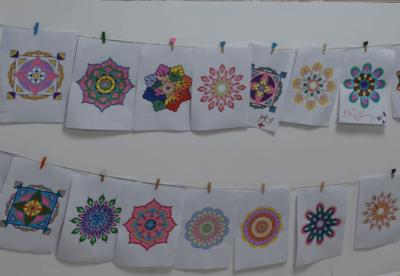 曼陀罗绘画本身具有放松身心,表达情绪的功能。在涂鸦过程中,有的同学选用暖色调传递内心的温暖与平静,也有人通过深色与强烈对比释放压力。这种简单的艺术形式,可以让每位同学都能在创作中觉察自己、安抚自己,实现情绪的释放。