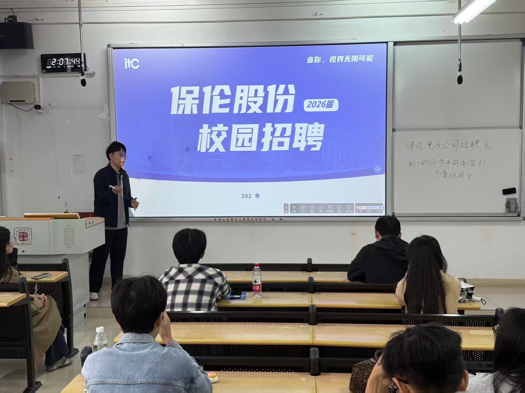 作为广东省500强企业、智能视讯行业领航者,保伦电子招聘团队首先介绍了企业自身的相关背景与发展概况,随后详细解读招聘岗位、薪资福利及晋升通道,为同学们选岗提供了清晰指引。最后,招聘团队与同学们面对面交流互动,现场沟通,并同步进行部分相关岗位测评,逐一解答大家关心的问题。