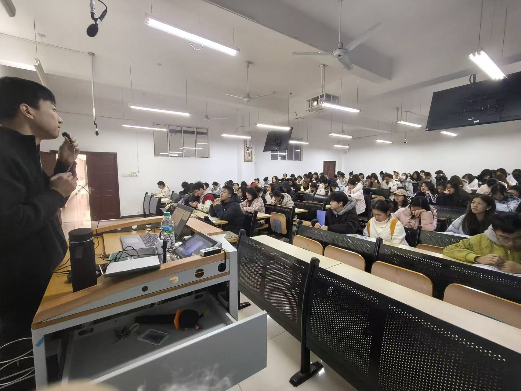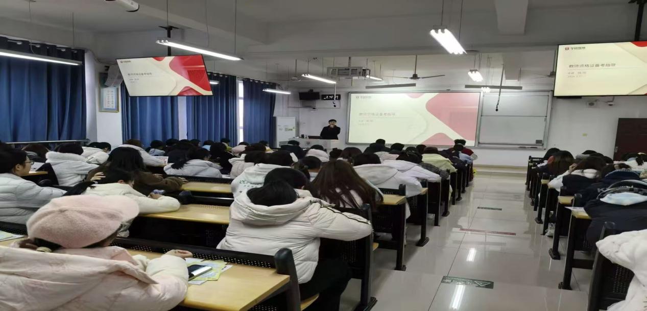 为帮助大一、大二学生系统掌握教资笔试流程与备考技能,有效提升教师资格证通过率,3月5日,经济管理与法学院联合华图教育,于逸夫楼成功举办“2026年教师资格证笔试考前冲刺”公益指导课。本次活动为创新创业类特色分享,为同学们提供专业的教资备考指导,同学们积极参与,现场参与氛围热烈。