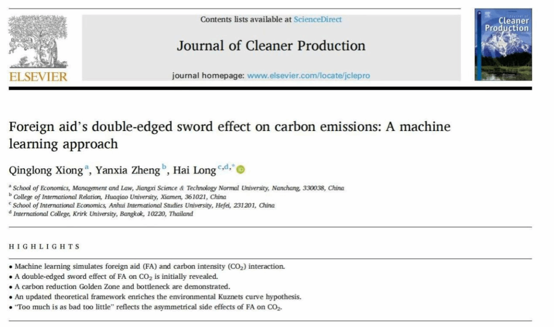 近日,我院熊青龙博士为第一作者的科研成果“外国援助对碳排放的双刃剑效应:一种机器学习方法”正式发表在《Journal of Cleaner Production》上,该期刊是中国科学院环境科学与可持续发展的一区顶刊,最新影响因子10.0,是聚焦于清洁生产、环境科学和可持续发展研究与实践的跨学科期刊,由国际知名出版集团爱思唯尔出版。