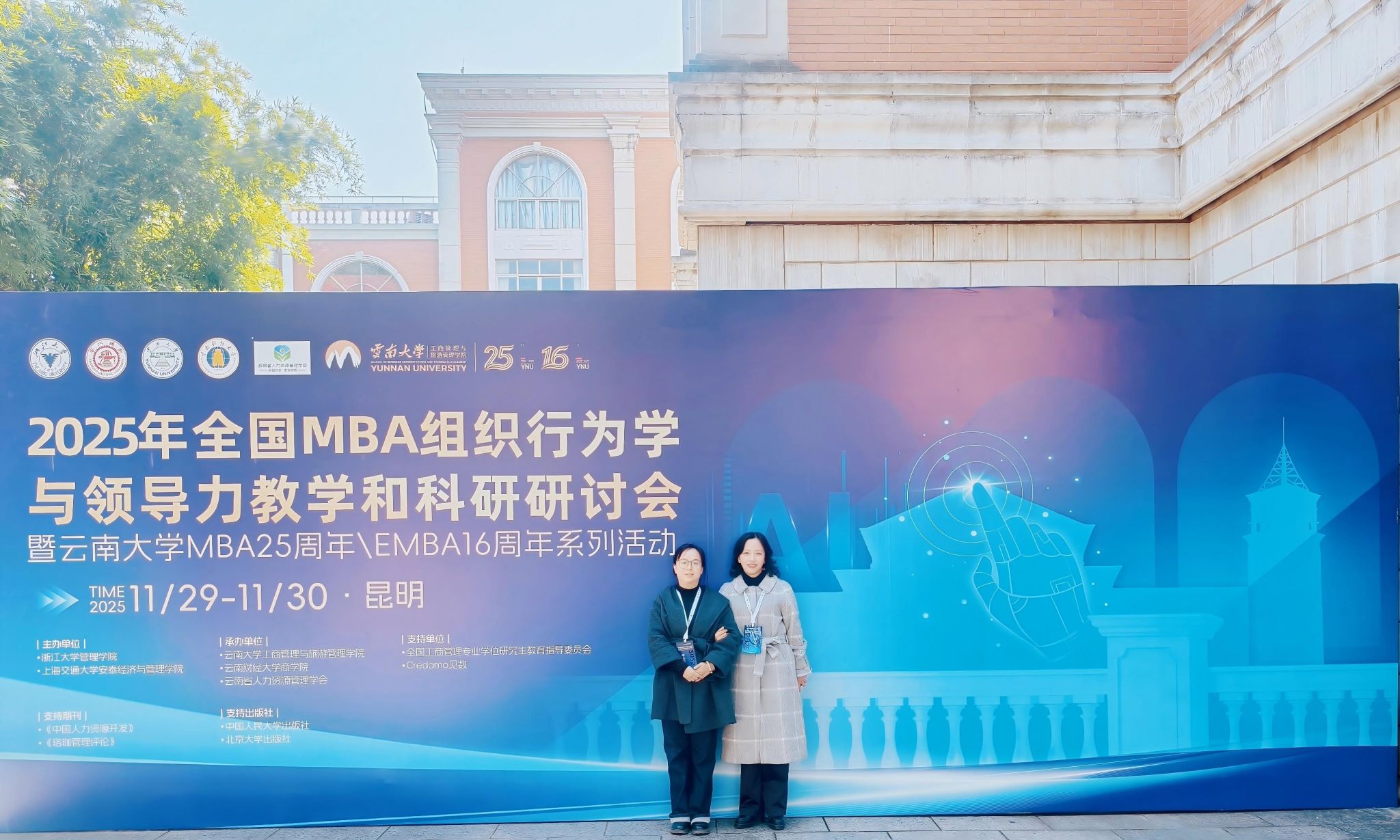 2025年11月29日至30日,“2025年全国MBA组织行为学与领导力教学和科研研讨会”在云南大学东陆校区隆重举行。本次会议得到全国工商管理专业学位研究生教育指导委员会的大力支持,吸引了来自全国多所高校的专家学者与业界同仁齐聚春城,共同探讨AI技术浪潮下组织行为学与领导力领域面临的新挑战、新变化与新发展。经济管理与法学院余薇与王燕子两位老师应邀参加了此次学术盛会。